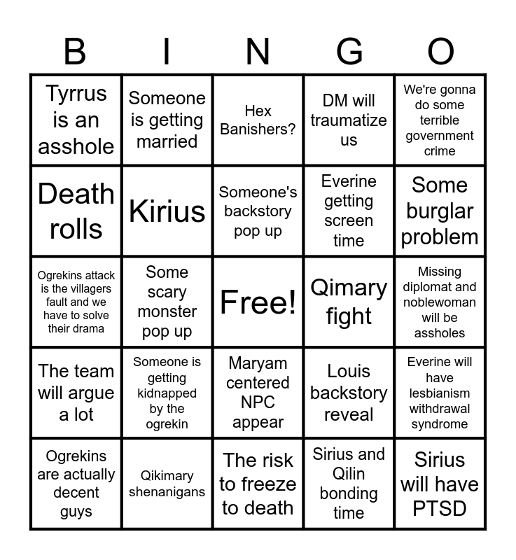 This bingo card has a free space and 24 words: Someone is getting kidnapped by the ogrekin, Qikimary shenanigans, Someone's backstory pop up, Ogrekins are actually decent guys, We're gonna do some terrible government crime, Tyrrus is an asshole, Death rolls, Someone is getting married, Qimary fight, Maryam centered NPC appear, Everine getting screen time, Ogrekins attack is the villagers fault and we have to solve their drama, Louis backstory reveal, Everine will have lesbianism withdrawal syndrome, Kirius, Sirius and Qilin bonding time, Missing diplomat and noblewoman will be assholes, Hex Banishers?, Some burglar problem, Some scary monster pop up, Sirius will have PTSD, The team will argue a lot, DM will traumatize us and The risk to freeze to death.