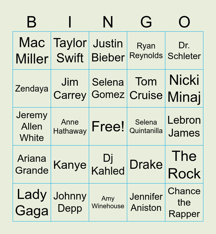 This bingo card has a free space and 29 words: Lady Gaga, Reese Witherspoon, Anne Hathaway, Morgan Freeman, Mac Miller, Justin Bieber, Jim Carrey, Kanye, Selena Quintanilla, Johnny Depp, Lebron James, Chance the Rapper, Amy Winehouse, Jennifer Aniston, Nicki Minaj, Cardi B, Dj Kahled, Ariana Grande, Dr. Schleter, Jeremy Allen White, Drake, Rihanna, Tom Cruise, Zendaya, Ryan Reynolds, Taylor Swift, The Rock, Selena Gomez and The Weekend.