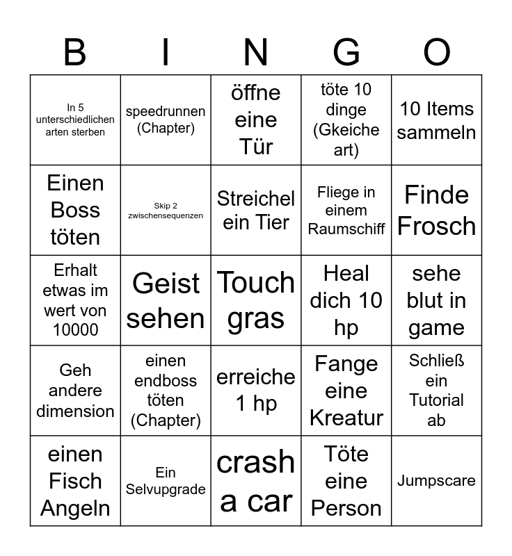 This bingo card has a free space and 24 words: einen endboss töten (Chapter), Ein Selvupgrade, Streichel ein Tier, einen Fisch Angeln, 10 Items sammeln, In 5 unterschiedlichen arten sterben, Einen Boss töten, speedrunnen (Chapter), Heal dich 10 hp, erreiche 1 hp, Fliege in einem Raumschiff, Erhalt etwas im wert von 10000, Fange eine Kreatur, Schließ ein Tutorial ab, Skip 2 zwischensequenzen, Töte eine Person, sehe blut in game, öffne eine Tür, Finde Frosch, Geist sehen, Jumpscare, Geh andere dimension, töte 10 dinge (Gkeiche art) and crash a car.