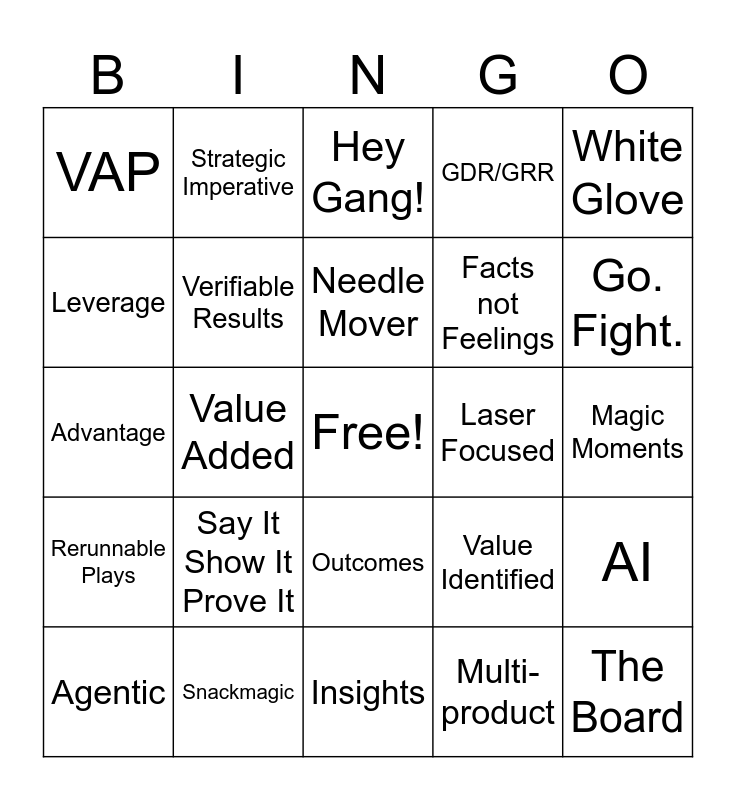 This bingo card has a free space and 24 words: Say It Show It Prove It, Snackmagic, Needle Mover, Agentic, White Glove, VAP, Leverage, Strategic Imperative, Laser Focused, Outcomes, Facts not Feelings, Advantage, Value Identified, AI, Verifiable Results, Multi-product, Magic Moments, Hey Gang!, Go. Fight., Value Added, The Board, Rerunnable Plays, GDR/GRR and Insights.