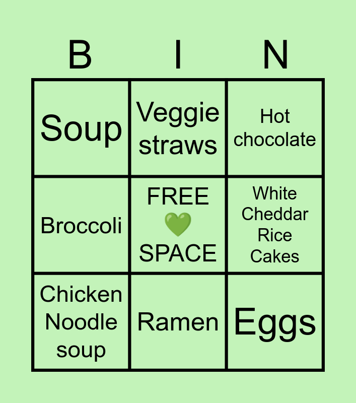 This bingo card has a free space and 8 words: White Cheddar Rice Cakes, Hot chocolate, Veggie straws, Chicken Noodle soup, Soup, Eggs, Broccoli and Ramen.