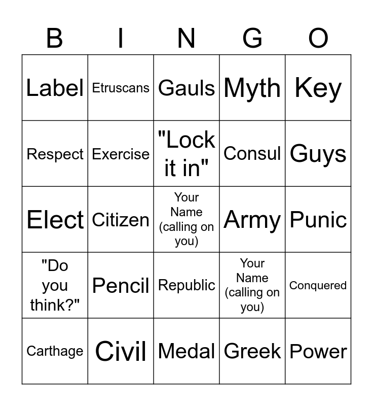 This bingo card has a free space and 25 words: Pencil, Medal, "Lock it in", Carthage, Key, Label, Respect, Etruscans, Army, Republic, Consul, Elect, Your Name (calling on you), Conquered, Exercise, Veto, Punic, Gauls, Guys, Citizen, Power, Civil, "Do you think?", Myth and Greek.