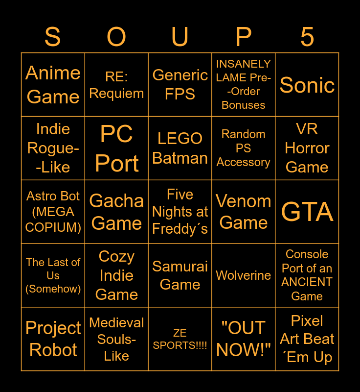 This bingo card has a free space and 24 words: Cozy Indie Game, Medieval Souls-Like, LEGO Batman, Project Robot, Sonic, Anime Game, Indie Rogue--Like, RE: Requiem, Venom Game, Samurai Game, Random PS Accessory, Astro Bot (MEGA COPIUM), Wolverine, Console Port of an ANCIENT Game, PC Port, "OUT NOW!", GTA, Generic FPS, VR Horror Game, Gacha Game, Pixel Art Beat ´Em Up, The Last of Us (Somehow), INSANELY LAME Pre--Order Bonuses and ZE SPORTS!!!!.