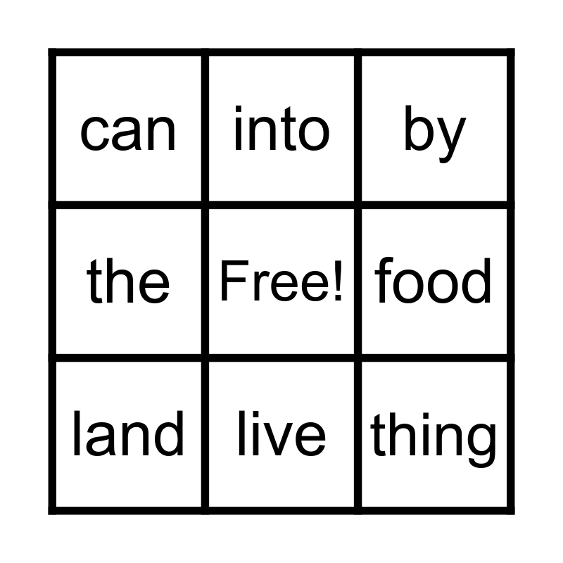 This bingo card has a free space and 18 words: about, and, by, can, not, the, black, into, live, look, read, thing, fish, food, land, learn, map and water.