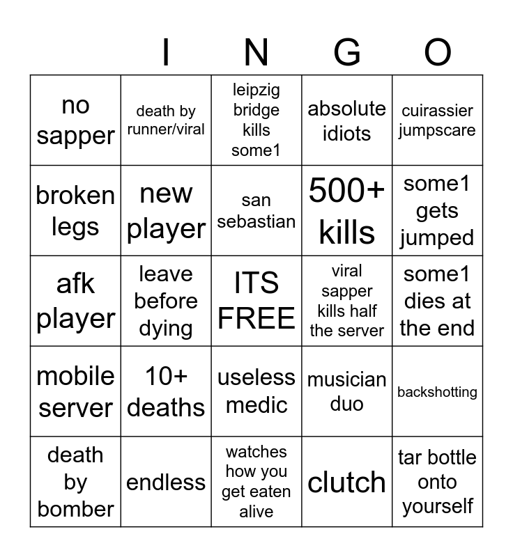This bingo card has a free space and 24 words: 10+ deaths, endless, san sebastian, death by bomber, cuirassier jumpscare, no sapper, broken legs, death by runner/viral, viral sapper kills half the server, useless medic, 500+ kills, afk player, musician duo, backshotting, new player, clutch, some1 dies at the end, leipzig bridge kills some1, some1 gets jumped, leave before dying, tar bottle onto yourself, mobile server, absolute idiots and watches how you get eaten alive.