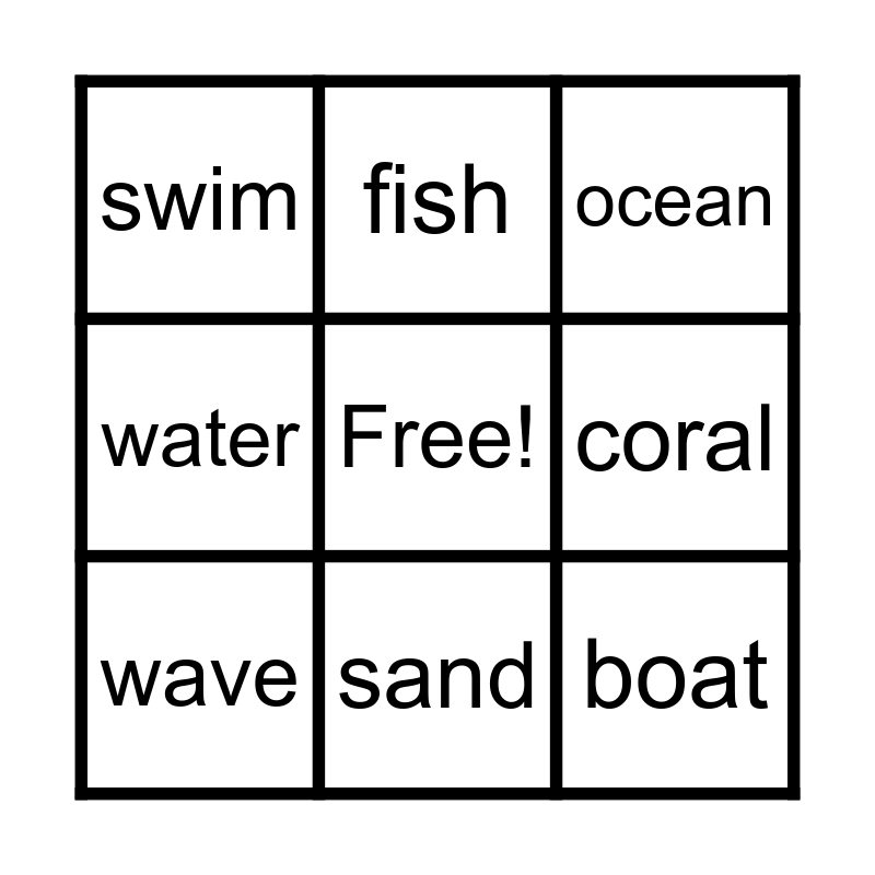 This bingo card has a free space and 12 words: algea, beach, boat, coral, fish, ocean, sand, shell, swim, water, wave and whale.