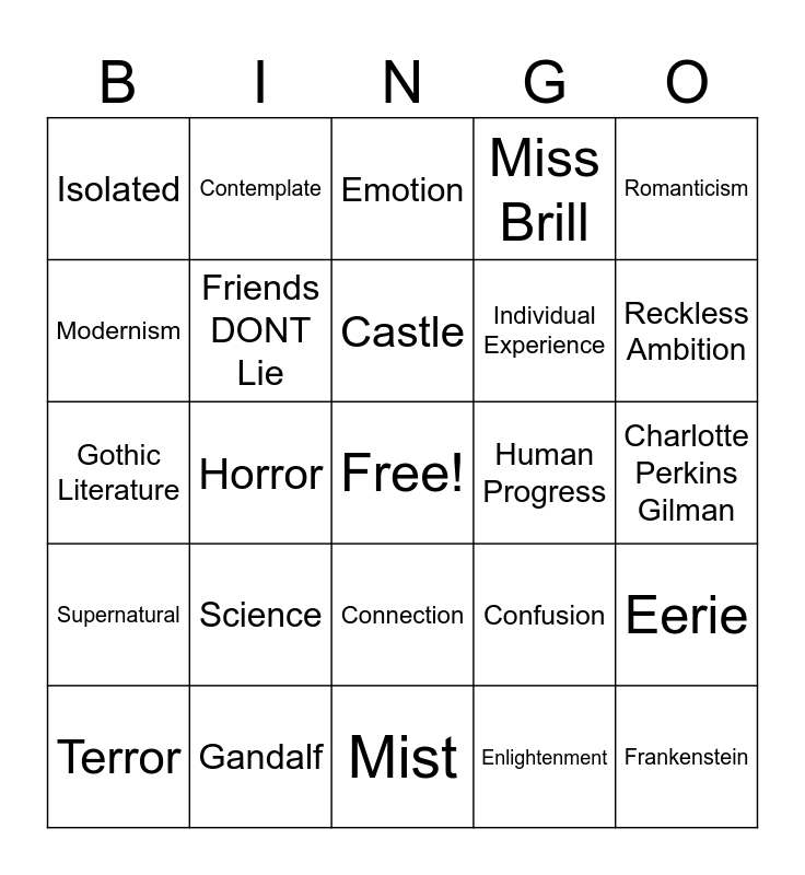 This bingo card has a free space and 24 words: Science, Gandalf, Castle, Terror, Romanticism, Isolated, Modernism, Contemplate, Human Progress, Connection, Individual Experience, Gothic Literature, Confusion, Eerie, Friends DONT Lie, Enlightenment, Charlotte Perkins Gilman, Emotion, Reckless Ambition, Horror, Frankenstein, Supernatural, Miss Brill and Mist.