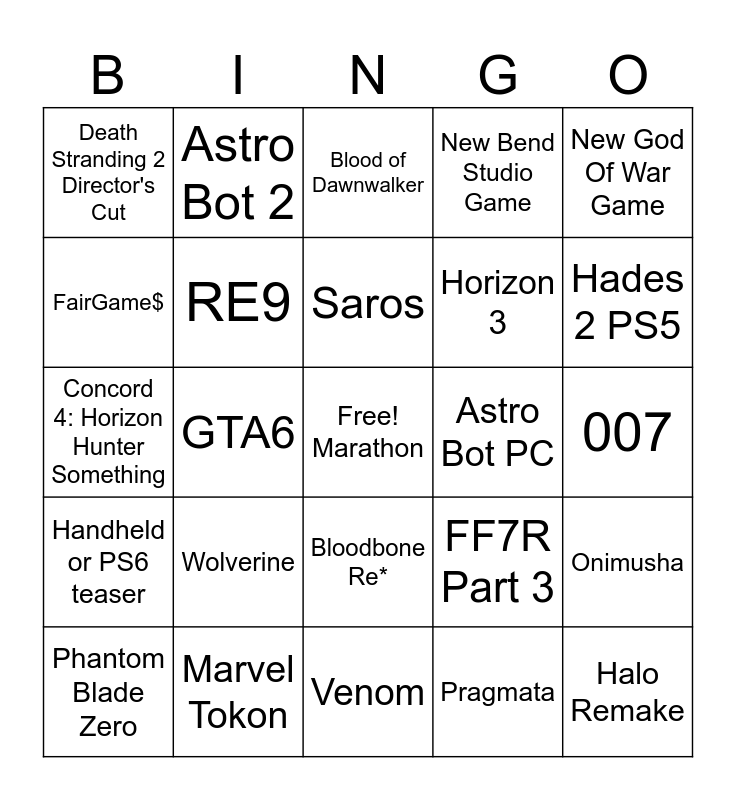 This bingo card has a free space and 24 words: Wolverine, Marvel Tokon, Saros, Phantom Blade Zero, New God Of War Game, Death Stranding 2 Director's Cut, FairGame$, Astro Bot 2, Astro Bot PC, Bloodbone Re*, Horizon 3, Concord 4: Horizon Hunter Something, FF7R Part 3, Onimusha, RE9, Pragmata, 007, Blood of Dawnwalker, Hades 2 PS5, GTA6, Halo Remake, Handheld or PS6 teaser, New Bend Studio Game and Venom.