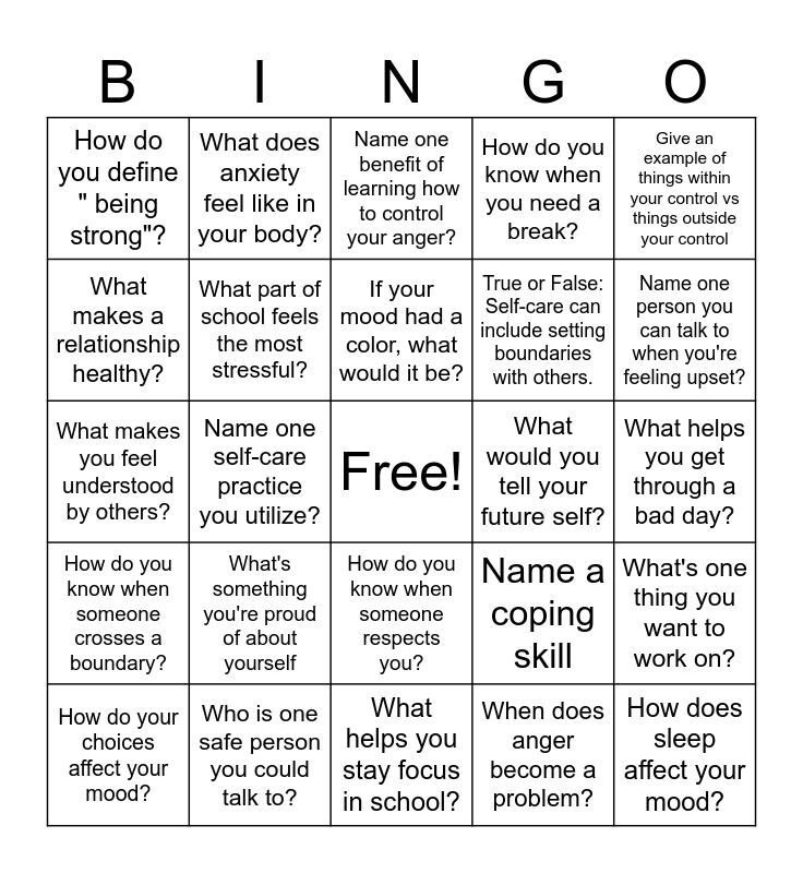 This bingo card has a free space and 24 words: What's something you're proud of about yourself, Who is one safe person you could talk to?, If your mood had a color, what would it be?, How do your choices affect your mood?, Give an example of things within your control vs things outside your control, How do you define " being strong"?, What makes a relationship healthy?, What does anxiety feel like in your body?, What would you tell your future self?, How do you know when someone respects you?, True or False: Self-care can include setting boundaries with others., What makes you feel understood by others?, Name a coping skill, What's one thing you want to work on?, What part of school feels the most stressful?, When does anger become a problem?, What helps you get through a bad day?, Name one benefit of learning how to control your anger?, Name one person you can talk to when you're feeling upset?, Name one self-care practice you utilize?, How does sleep affect your mood?, How do you know when someone crosses a boundary?, How do you know when you need a break? and What helps you stay focus in school?.