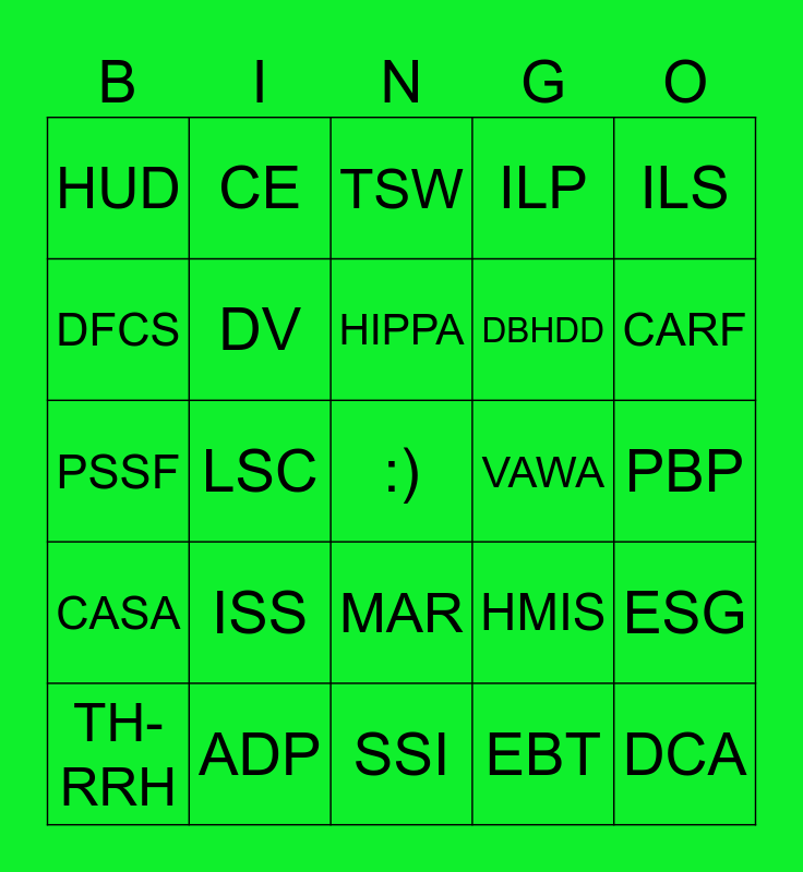 This bingo card has a free space and 46 words: ACES, ADP, BMSE, CANS, CARF, CASA, CE, CM, DBHDD, DCA, DFCS, DV, EBT, ESG, FYSB, GAL, HIPPA, HMIS, HQS, HUD, ISS, IEP, ILP, ILS, ISP, LSC, MAR, NYTD, PBP, PSSF, RHY, RRH, SNAP, SOAR, SOP, SSDI, SSI, STRIVE, TH, TH-RRH, TLP, TSW, VAWA, VI-SPDAT-TAY, WTLP and YDHP.