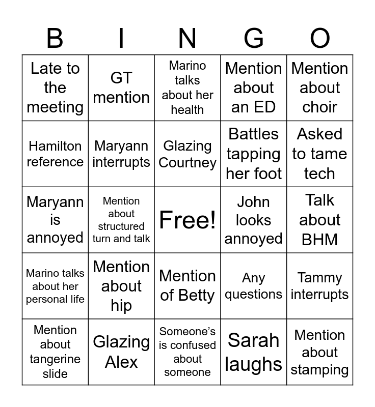 This bingo card has a free space and 24 words: Mention about hip, Glazing Alex, Glazing Courtney, Mention about tangerine slide, Mention about choir, Late to the meeting, Hamilton reference, GT mention, John looks annoyed, Mention of Betty, Battles tapping her foot, Maryann is annoyed, Any questions, Tammy interrupts, Maryann interrupts, Sarah laughs, Talk about BHM, Marino talks about her health, Asked to tame tech, Mention about structured turn and talk, Mention about stamping, Marino talks about her personal life, Mention about an ED and Someone’s is confused about someone.
