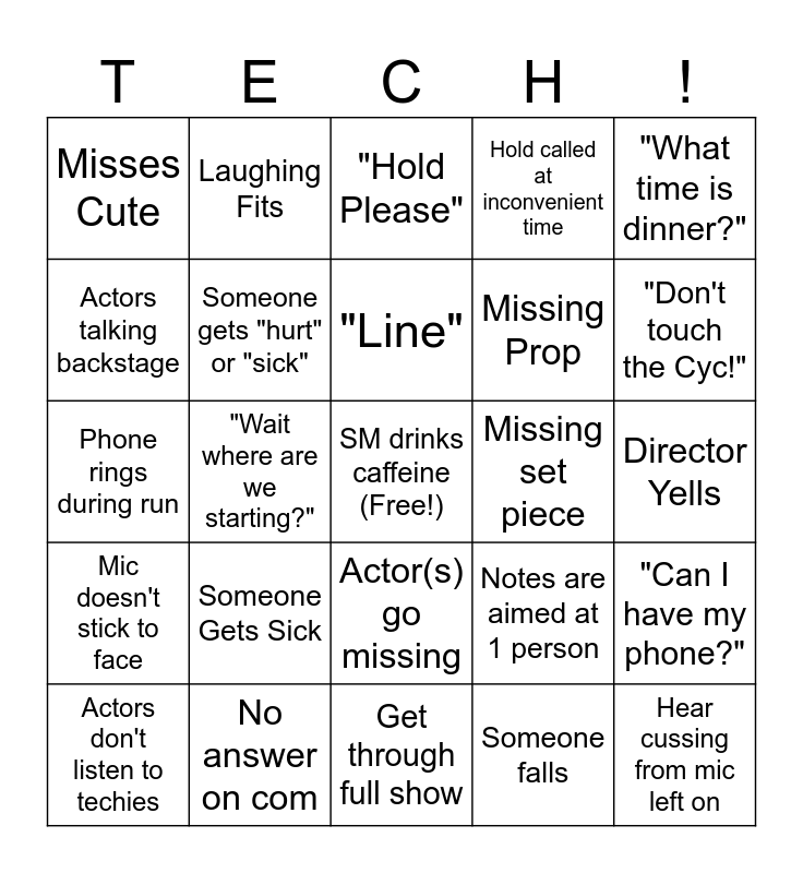 This bingo card has a free space and 24 words: Someone Gets Sick, No answer on com, "Line", Actors don't listen to techies, "What time is dinner?", Misses Cute, Actors talking backstage, Laughing Fits, Missing set piece, Actor(s) go missing, Missing Prop, Phone rings during run, Notes are aimed at 1 person, "Can I have my phone?", Someone gets "hurt" or "sick", Someone falls, Director Yells, "Hold Please", "Don't touch the Cyc!", "Wait where are we starting?", Hear cussing from mic left on, Mic doesn't stick to face, Hold called at inconvenient time and Get through full show.