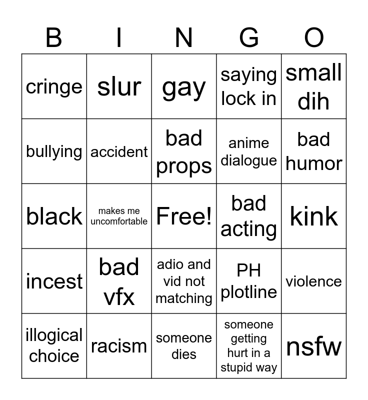 This bingo card has a free space and 24 words: bad vfx, racism, bad props, illogical choice, small dih, cringe, bullying, slur, bad acting, adio and vid not matching, anime dialogue, black, PH plotline, violence, accident, someone getting hurt in a stupid way, kink, gay, bad humor, makes me uncomfortable, nsfw, incest, saying lock in and someone dies.