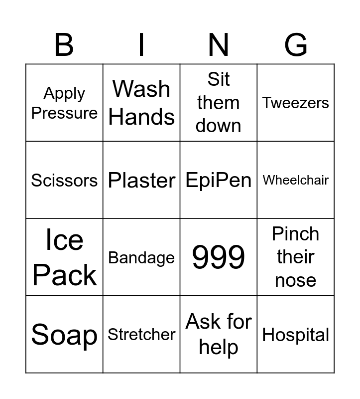 This bingo card has 31 words: Free!, Phone, Pinch their nose, Adult, Apply Pressure, Sit them down, EpiPen, Paremedics, Stretcher, Help them if you can, Ask for help, Soap, Ambulance, First Aid box, Bandage, Safety Pin, Face Mask, Space Blanket, Hospital, Accident form, Scissors, Helipad, Doctor/Nurse, Wash Hands, Ice Pack, Plaster, Tweezers, 999, Inhaler, Wheelchair and Gloves.