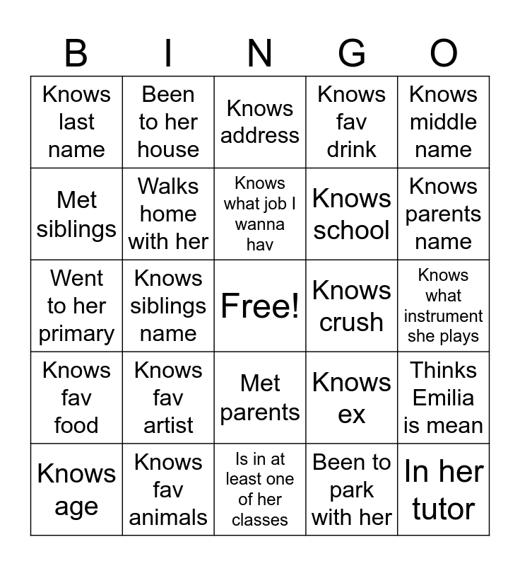 This bingo card has a free space and 24 words: Knows fav artist, Knows fav animals, Knows what job I wanna hav, Knows age, Knows middle name, Knows last name, Met siblings, Been to her house, Knows crush, Met parents, Knows school, Went to her primary, Knows ex, Thinks Emilia is mean, Walks home with her, Been to park with her, Knows what instrument she plays, Knows address, Knows parents name, Knows siblings name, In her tutor, Knows fav food, Knows fav drink and Is in at least one of her classes.