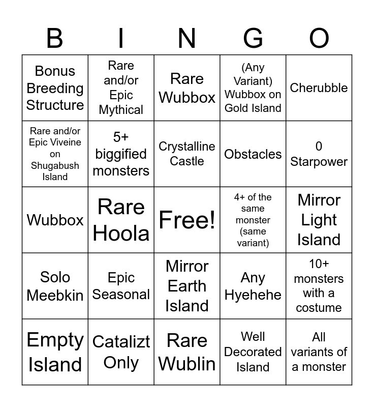 This bingo card has a free space and 49 words: 100k+ Starpower, All variants of a monster, Coin Farm, Rare Wublin, Epic Seasonal, Rare Wubbox on Wublin Island, Rare and/or Epic Mythical, Star Rocks, Rare and/or Epic Viveine on Shugabush Island, Seasonal Skin (not current event), 5+ biggified monsters, (Any Variant) Wubbox on Gold Island, 10+ monsters with a costume, Any Hyehehe, Bakery finished baking, Mammott only Colossingum/ Composer Island, Crystalline Castle, 4+ of the same monster (same variant), $1 mil+ decoration, Cherubble, Rare Hoola, Well Decorated Island, Bonus Breeding Structure, Obstacles, Full Celestial Island, 0 Starpower, Empty Island, Seasonal Decoration, Mirror Earth Island, Solo Meebkin, Bee-mee-beth, Rare Wubbox, Maxi Mine, A Boxed Wubbox, Catalizt Only, Primoridial, CG5, BBNO$, Mirror Light Island, Shitty composer song, Angelic Composer Song, Pixel Art, Glowbe, Epic Ethereal, Wubbox, Rare Wubbox, Full Song, Quite Literally nothing and Number Statues(from anniversary).