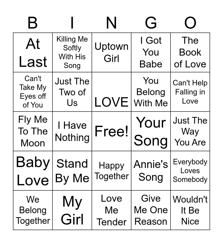 This bingo card has a free space and 24 words: Stand By Me, My Girl, LOVE, We Belong Together, The Book of Love, At Last, Can't Take My Eyes off of You, Killing Me Softly With His Song, Your Song, Happy Together, You Belong With Me, Fly Me To The Moon, Annie's Song, Everybody Loves Somebody, Just The Two of Us, Give Me One Reason, Just The Way You Are, Uptown Girl, Can't Help Falling in Love, I Have Nothing, Wouldn't It Be Nice, Baby Love, I Got You Babe and Love Me Tender.