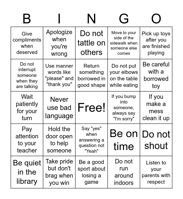 This bingo card has a free space and 40 words: Wash your hands before you eat, Wait patiently for your turn, Wait for others to get off the bus before getting on, Use manner words like "please" and "thank you", Take pride but don't brag when you win, Say "yes" when answering a question not "Yeah", Return something borrowed in good shape, Place your napkin in your lap while eating, Pick up toys after you are finished playing, Pay attention to your teacher, Never use bad language, Move to your side of the sidewalk when someone else comes, Listen to your parents with respect, If you make a mess clean it up, If you bump into someone, always say "I'm sorry", Hold the door open to help someone, Help clear the table after eating, Give compliments when deserved, Don't talk while chewing your food, Do not tattle on others, Do not shout, Do not run around indoors, Do not put your elbows on the table while eating, Do not interrupt someone when they are talking, Do not gossip or talk about other people in a bad way, Cut your food into bite sized pieces, Cover your mouth when you cough, Compliment the Chef, Chew gum with mouth closed, Chew food with your mouth closed, Be respectful in Church, Be quiet in the library, Be quiet during the movie, Be on time, Be careful with a borrowed toy, Be a good sport about losing a game, Ask to be excused before leaving the table, Ask permission to borrow something, Apologize when you're wrong and Always put your trash in the trash can.