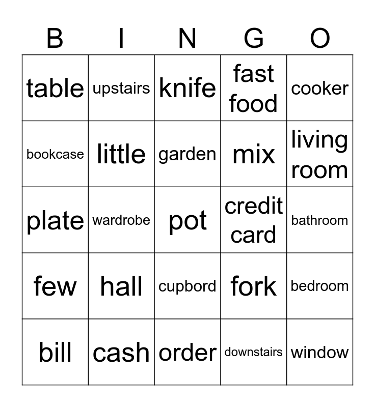 This bingo card has 42 words: kitchen, garden, cup, hall, downstairs, bedroom, pot, spoon, knife, cupbord, bathroom, living room, wardrobe, cooker, oven, fork, fridge, plate, pan, upstairs, bookcase, bedside table, window, table, carpet, add, mix, boil, serve, a few, a little, few, little, order, waiter, bill, cash, credit card, cut, junk food, fast food and healthy.