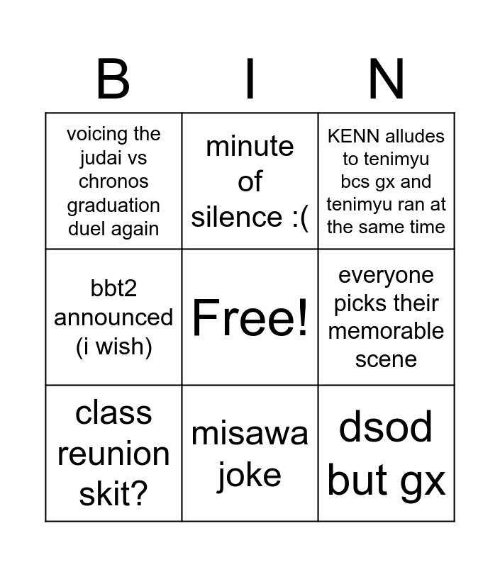 This bingo card has a free space and 8 words: everyone picks their memorable scene, KENN alludes to tenimyu bcs gx and tenimyu ran at the same time, minute of silence :(, class reunion skit?, voicing the judai vs chronos graduation duel again, dsod but gx, bbt2 announced (i wish) and misawa joke.