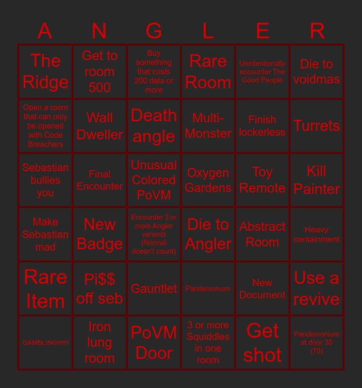 This bingo card has 36 words: Pandemonium, Gauntlet, 3 or more Squiddles in one room, Open a room that can only be opened with Code Breachers, Make Sebastian mad, Oxygen Gardens, Wall Dweller, PoVM Door, Unintentionally encounter The Good People, New Document, Turrets, Rare Room, Use a revive, Final Encounter, Multi-Monster, The Ridge, Rare Item, Toy Remote, Sebastian bullies you, Buy something that costs 200 data or more, Unusual Colored PoVM, New Badge, Die to Angler, Encounter 3 or more Angler variants (Normal doesn't count), Abstract Room, Get to room 500, Finish lockerless, Iron lung room, Death angle, Die to voidmas, Pandemonium at door 30 (70), GAMBLING!!!!!!, Heavy containment, Kill Painter, Pi$$ off seb and Get shot.