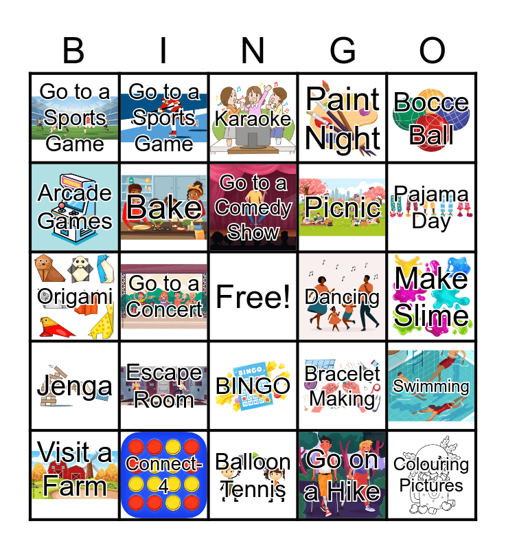 This bingo card has 29 images, a free space and 29 words: Visit a Farm, Puppy Yoga, Go to a Concert, Trivia, Go to a Sports Game, Karaoke, Bake, Escape Room, Dancing, Connect-4, Make Slime, Colouring Pictures, Balloon Tennis, Go on a Hike, Pajama Day, Bowling, BINGO, Jenga, Bocce Ball, Origami, Bracelet Making, UNO, Picnic, Arcade Games, Paint Night, Go to a Sports Game, Swimming, Go to a Comedy Show and Visit an Aquarium.