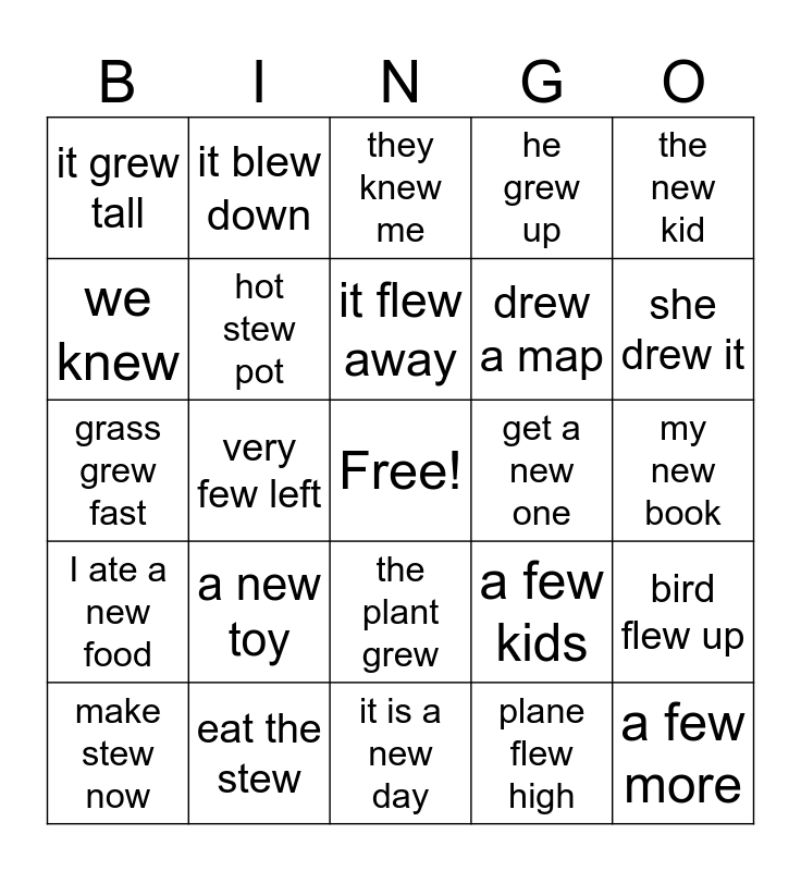 This bingo card has a free space and 24 words: a new toy, eat the stew, it flew away, make stew now, the new kid, it grew tall, we knew, it blew down, get a new one, the plant grew, drew a map, grass grew fast, a few kids, bird flew up, hot stew pot, plane flew high, my new book, they knew me, she drew it, very few left, a few more, I ate a new food, he grew up and it is a new day.