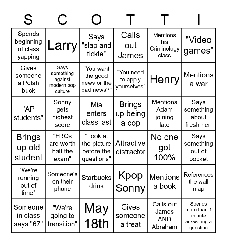 This bingo card has 36 words: Kpop Sonny, Starbucks drink, Gives someone a treat, Gives someone a Polah buck, Brings up old student, Brings up being a cop, Says something against modern pop culture, May 18th, Mentions his Criminology class, Mentions a book, Mentions a war, Calls out James, References the wall map, Sonny gets highest score, "You need to apply yourselves", Spends beginning of class yapping, "We're running out of time", Mentions Adam joining late, "AP students", Says "slap and tickle", Mia enters class last, "FRQs are worth half the exam", Attractive distractor, "Look at the picture before the questions", No one got 100%, Larry, Henry, "We're going to transition", "You want the good news or the bad news?", "Video games", Spends more than 1 minute answering a question, Someone in class says "67", Says something out of pocket, Says something about freshmen, Someone's on their phone and Calls out James AND Abraham.