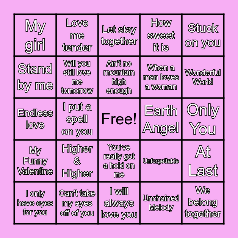 This bingo card has a free space and 28 words: At Last, Can't help falling in love, When a man loves a woman, Unchained Melody, Stand by me, Let stay together, Love me tender, My Funny Valentine, Earth Angel, I only have eyes for you, Endless love, How sweet it is, Can't take my eyes off of you, I will always love you, Wonderful World, Sealed with a kiss, Higher & Higher, Will you still love me tomorrow, Ain't no mountain high enough, You've really got a hold on me, My girl, Dream Lover, We belong together, I put a spell on you, Only You, Unforgettable, Stuck on you and Be my Baby.