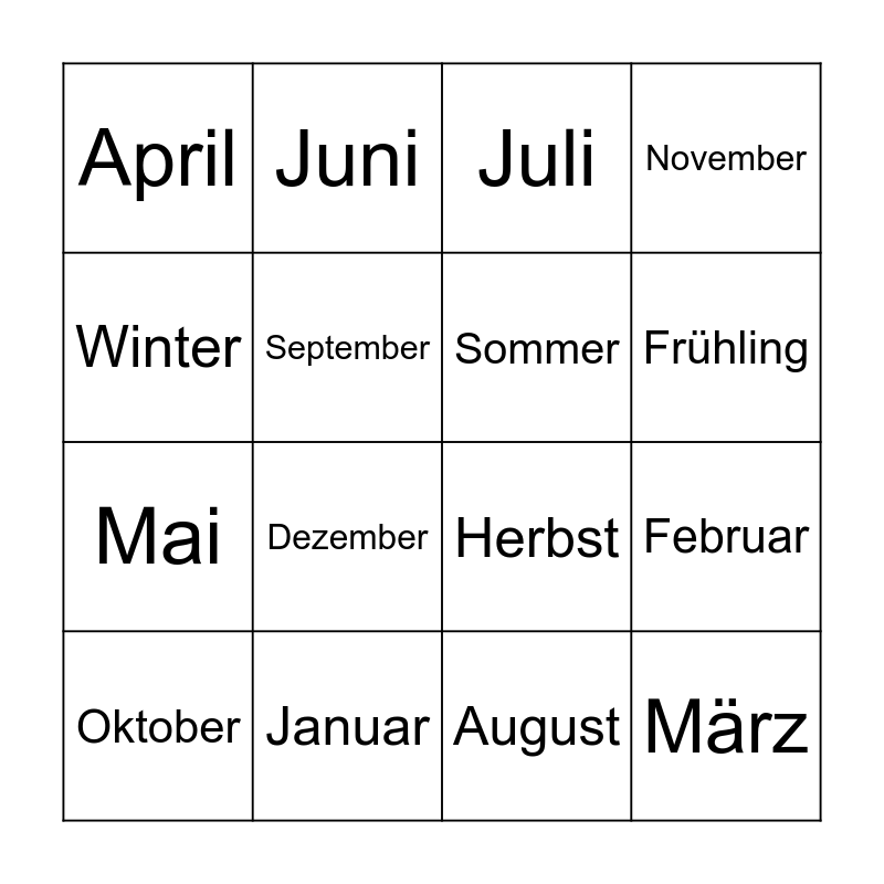This bingo card has 16 words: Januar, Februar, Juli, April, Mai, Juni, Herbst, August, Winter, September, Oktober, November, Dezember, Frühling, Sommer and März.