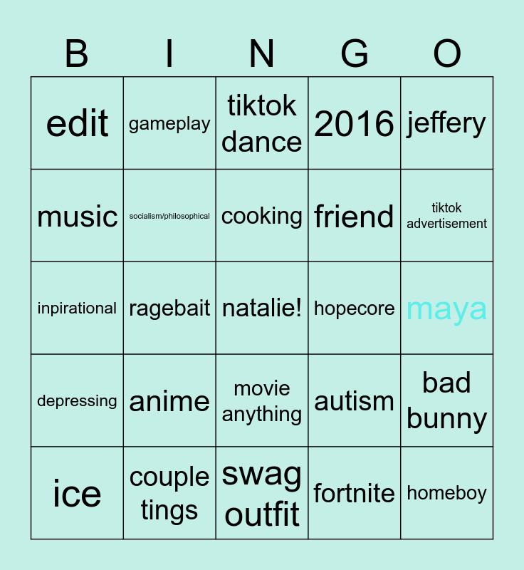 This bingo card has a free space and 24 words: anime, couple tings, cooking, ice, jeffery, edit, music, gameplay, hopecore, movie anything, friend, inpirational, autism, bad bunny, socialism/philosophical, fortnite, maya, tiktok dance, tiktok advertisement, ragebait, homeboy, depressing, 2016 and swag outfit.