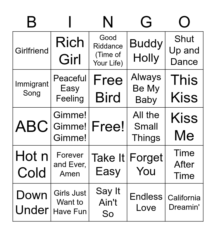 This bingo card has a free space and 54 words: I want to Break Free, Hot n Cold, Since U Been Gone, I Can't Help Myself (Sugar Pie, Honey Bunch), Take It Easy, Locked Out of Heaven, Buddy Holly, Basket Case, Immigrant Song, Yesterday, Girlfriend, Africa, Girls Just Want to Have Fun, Down Under, Over My Head, Say It Ain't So, California Dreamin', Always Be My Baby, Separate Ways, Kiss Me, Forget You, Two Dozen Roses, All the Small Things, Shut Up and Dance, Jump, Rich Girl, Heaven, Take Me Home Tonight, Your Love, Endless Love, For Once in My Life, Material Girl, Oh Sherrie, Wake Me Up Before You Go-Go, Good Riddance (Time of Your Life), Just My Imagination, ABC, Time After Time, Just the Two of Us, Peaceful Easy Feeling, Celebration, Thunder Road, Signed, Sealed, Delivered(I'm Yours), Believe, Forever and Ever, Amen, Everywhere, September, Dancing With Myself, Free Bird, Gimme! Gimme! Gimme!, This Kiss, Fancy, I will Always Love You and Let's Get It On.