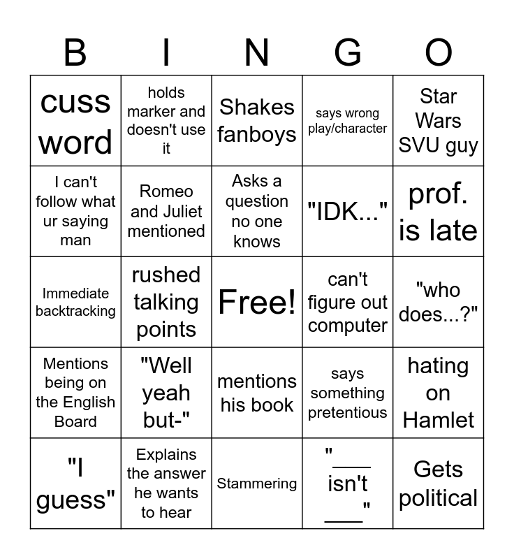 This bingo card has a free space and 24 words: "Well yeah but-", Explains the answer he wants to hear, Asks a question no one knows, "I guess", Star Wars SVU guy, cuss word, I can't follow what ur saying man, holds marker and doesn't use it, can't figure out computer, mentions his book, "IDK...", Immediate backtracking, says something pretentious, hating on Hamlet, Romeo and Juliet mentioned, "___ isn't ___", "who does...?", Shakes fanboys, prof. is late, rushed talking points, Gets political, Mentions being on the English Board, says wrong play/character and Stammering.