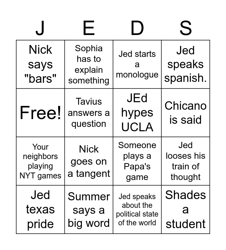 This bingo card has 16 words: Summer says a big word, Jed looses his train of thought, Jed starts a monologue, Nick says "bars", Your neighbors playing NYT games, Sophia has to explain something, Someone plays a Papa's game, Jed speaks about the political state of the world, Free!, Tavius answers a question, Jed texas pride, Jed speaks spanish., Nick goes on a tangent, Chicano is said, JEd hypes UCLA and Shades a student.
