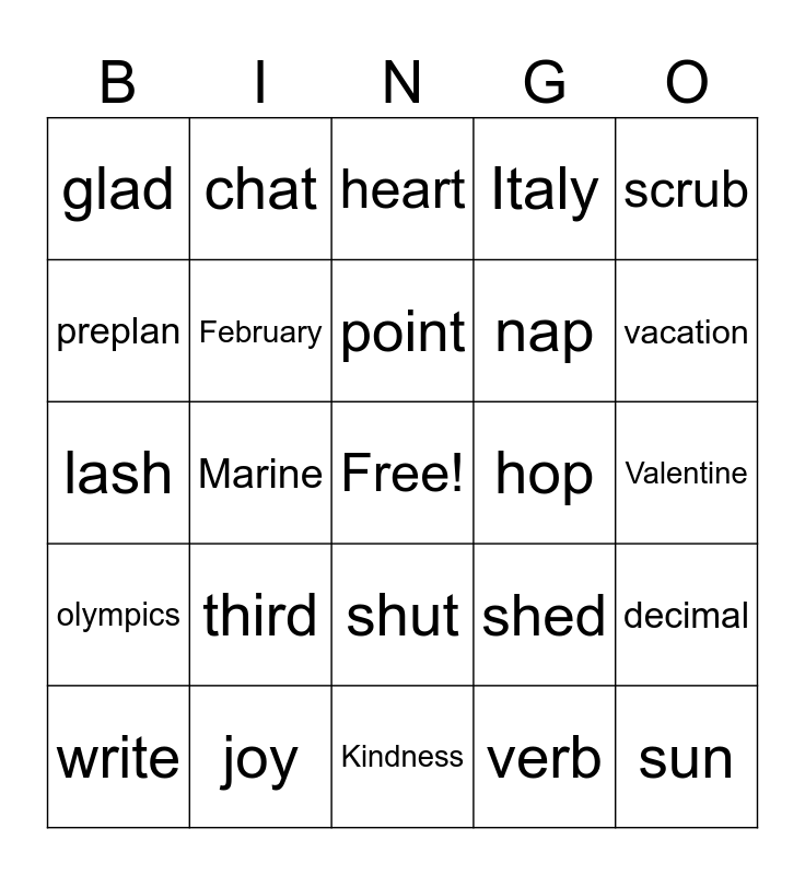 This bingo card has a free space and 24 words: third, joy, point, write, scrub, glad, preplan, chat, hop, shut, nap, lash, shed, decimal, February, verb, Valentine, heart, vacation, Marine, sun, olympics, Italy and Kindness.