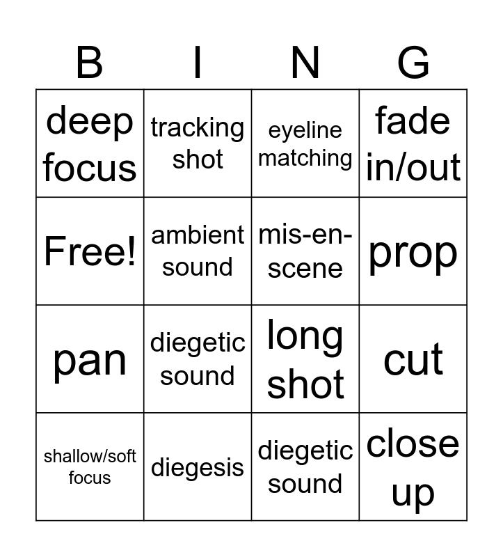 This bingo card has 16 words: diegesis, cut, eyeline matching, deep focus, pan, tracking shot, long shot, diegetic sound, Free!, ambient sound, shallow/soft focus, fade in/out, diegetic sound, prop, mis-en-scene and close up.