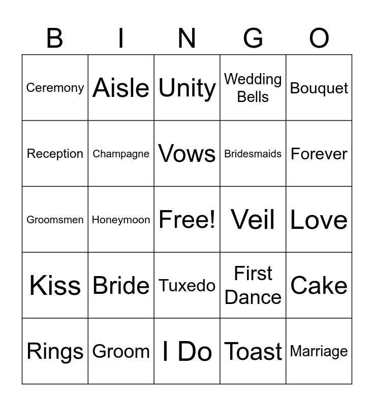 This bingo card has a free space and 24 words: Bride, Groom, Vows, Rings, Bouquet, Ceremony, Reception, Aisle, Veil, Tuxedo, Bridesmaids, Groomsmen, First Dance, Cake, Champagne, Toast, Love, Unity, Forever, Honeymoon, Marriage, Kiss, Wedding Bells and I Do.