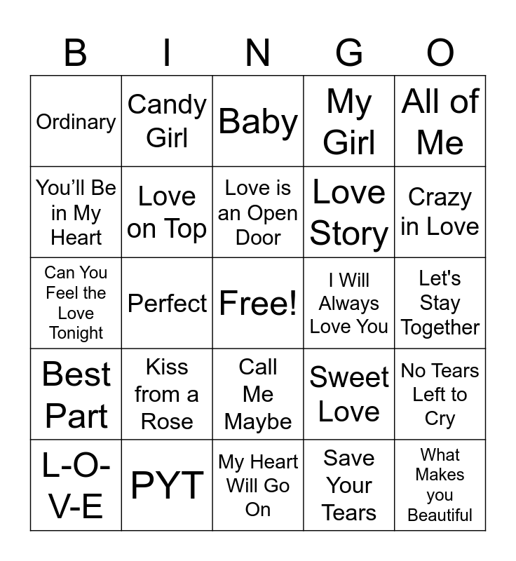 This bingo card has a free space and 41 words: Take My Breath Away, Can You Feel the Love Tonight, At Last, Love on Top, PYT, Call Me Maybe, Love is an Open Door, Lose Control, All of Me, Best Part, Perfect, My Girl, What Makes you Beautiful, Let's Stay Together, I Will Always Love You, Kiss from a Rose, I Don't Want to Miss a Thing, Ordinary, Soda Pop, Baby, No Tears Left to Cry, Thank U, Next, My Heart Will Go On, Love Story, In My Feelings, Stay, Save Your Tears, Speechless, Crazy in Love, Love, I Got You, Babe, Candy Girl, L-O-V-E, I Wanna Rock With You, Sweet Love, You’ll Be in My Heart, Water Under the Bridge, Cupid Shuffle, Together Forever, Pretty Little Baby and Die with a Smile.