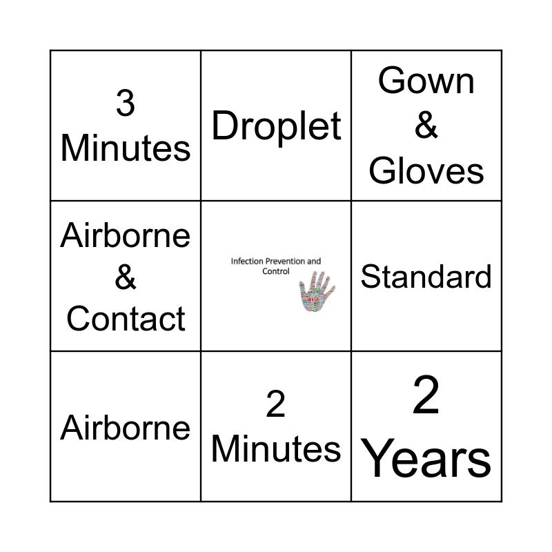 This bingo card has a free space and 14 words: Contact, Contact-handwashing, Airborne, Droplet, Airborne & Contact, 2 Years, Wash hands with soap and water, Wet Time, 2 Minutes, 3 Minutes, Droplet & Contact, Standard, Gown & Gloves and Negative pressure room, keep door closed.