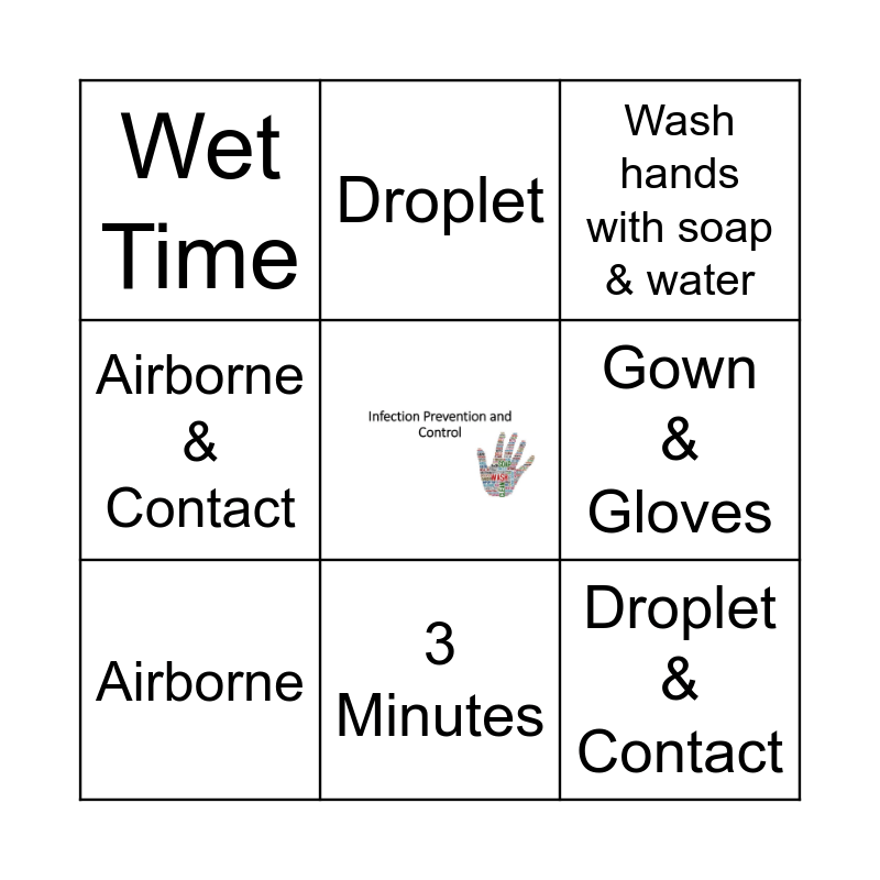 This bingo card has a free space and 14 words: Contact, Contact-handwashing, Airborne, Droplet, Airborne & Contact, Droplet & Contact, Standard, 2 Minutes, 3 Minutes, Wet Time, Negative pressure room, keep door closed, Gown & Gloves, Wash hands with soap & water and 2 Years.