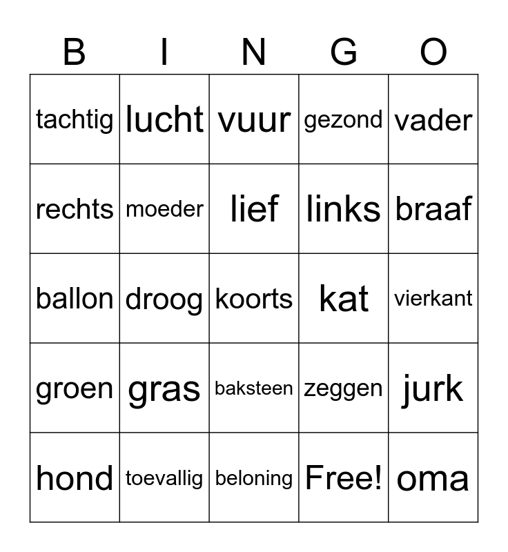 This bingo card has 32 words: Free!, koud, droog, lekker, groen, moeder, vader, jurk, lucht, oma, lief, vuur, zee, blauw, kat, dag, hond, ballon, baksteen, gras, zeggen, zon, vierkant, toevallig, koorts, gezond, links, rechts, tachtig, beloning, dief and braaf.