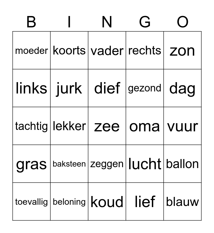 This bingo card has 31 words: koud, droog, lekker, groen, moeder, vader, jurk, lucht, oma, lief, vuur, zee, blauw, kat, dag, hond, ballon, baksteen, gras, zeggen, zon, vierkant, toevallig, koorts, gezond, links, rechts, tachtig, beloning, dief and braaf.