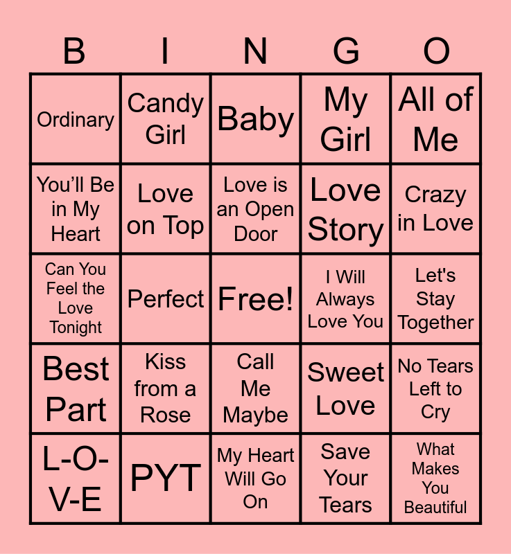 This bingo card has a free space and 41 words: Take My Breath Away, Can You Feel the Love Tonight, At Last, Love on Top, PYT, Call Me Maybe, Love is an Open Door, Lose Control, All of Me, Best Part, Perfect, My Girl, What Makes You Beautiful, Let's Stay Together, I Will Always Love You, Kiss from a Rose, I Don't Want to Miss a Thing, Ordinary, Soda Pop, Baby, No Tears Left to Cry, Thank U, Next, My Heart Will Go On, Love Story, In My Feelings, Stay, Save Your Tears, Speechless, Crazy in Love, Love, I Got You, Babe, Candy Girl, L-O-V-E, I Wanna Rock With You, Sweet Love, You’ll Be in My Heart, Water Under the Bridge, Cupid Shuffle, Together Forever, Pretty Little Baby and Die with a Smile.