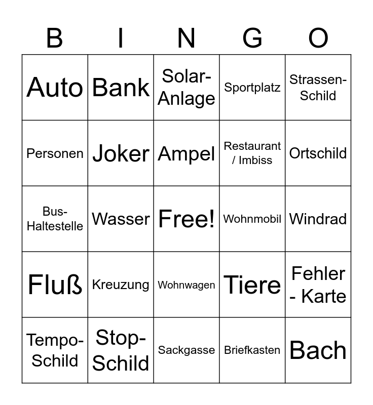 This bingo card has a free space and 24 words: Kreuzung, Stop-Schild, Ampel, Tempo-Schild, Strassen-Schild, Auto, Personen, Bank, Wohnmobil, Wohnwagen, Restaurant / Imbiss, Bus-Haltestelle, Tiere, Fehler - Karte, Joker, Briefkasten, Windrad, Solar-Anlage, Ortschild, Wasser, Bach, Fluß, Sportplatz and Sackgasse.