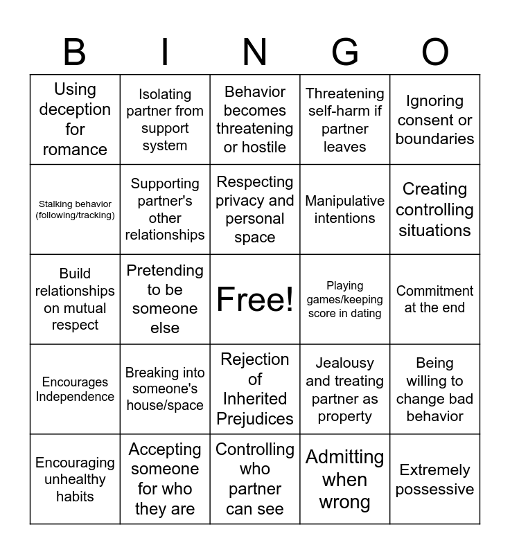 This bingo card has a free space and 51 words: Lying about identity to start relationship, Extremely possessive, Honest apology and accountability, Controlling who partner can see, Breaking into someone's house/space, Respecting boundaries when told "no", Isolating partner from support system, Direct communication about feelings, Stalking behavior (following/tracking), Love bombing (too much, too fast), Supporting partner's other relationships, Threatening self-harm if partner leaves, Being willing to change bad behavior, Jealousy and treating partner as property, Showing up authentically (being real), Using manipulation to get what you want, Respecting privacy and personal space, Playing games/keeping score in dating, Taking time to genuinely get to know someone, Ignoring consent or boundaries, Pretending to be someone else, Admitting when wrong, Using deception for romance, Manipulative intentions, Invaded privacy, Becomes intensely attached, Creating controlling situations, Avoiding emotional honesty, Encouraging unhealthy habits, Behavior becomes threatening or hostile, Relationships built on status or image, Choosing honesty eventually, Fighting for a genuine connection, Personal growth, Supporting a friend’s happiness, Accepting someone for who they are, Standing up for true feelings, Leaving toxic relationships, Publicly admits mistakes, Emotional vulnerability, Commitment at the end, Encourages Independence, Safety Over Ego, Consistent Self-less Presence, Treats everyone with kindness, Exhibits Self-control, Build relationships on mutual respect, Doesn’t compete for status/attention, Attentive Listening, Rejection of Inherited Prejudices and Hides behind jokes.