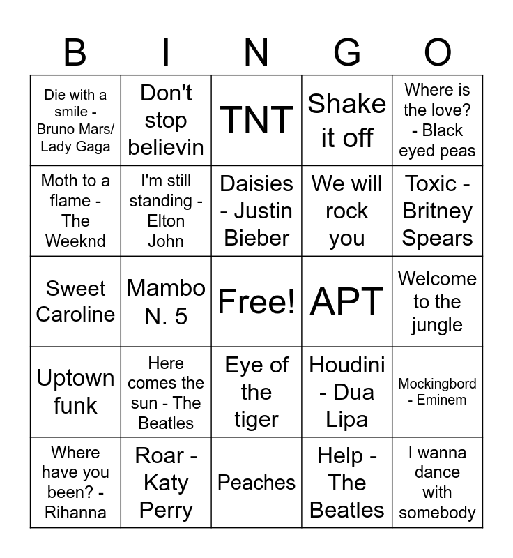 This bingo card has a free space and 24 words: Here comes the sun - The Beatles, Roar -Katy Perry, Daisies - Justin Bieber, Where have you been? -Rihanna, Where is the love? - Black eyed peas, Die with a smile - Bruno Mars/ Lady Gaga, Moth to a flame - The Weeknd, Don't stop believin, APT, Eye of the tiger, We will rock you, Sweet Caroline, Houdini - Dua Lipa, Mockingbord - Eminem, I'm still standing - Elton John, Help - The Beatles, Welcome to the jungle, TNT, Toxic - Britney Spears, Mambo N. 5, I wanna dance with somebody, Uptown funk, Shake it off and Peaches.