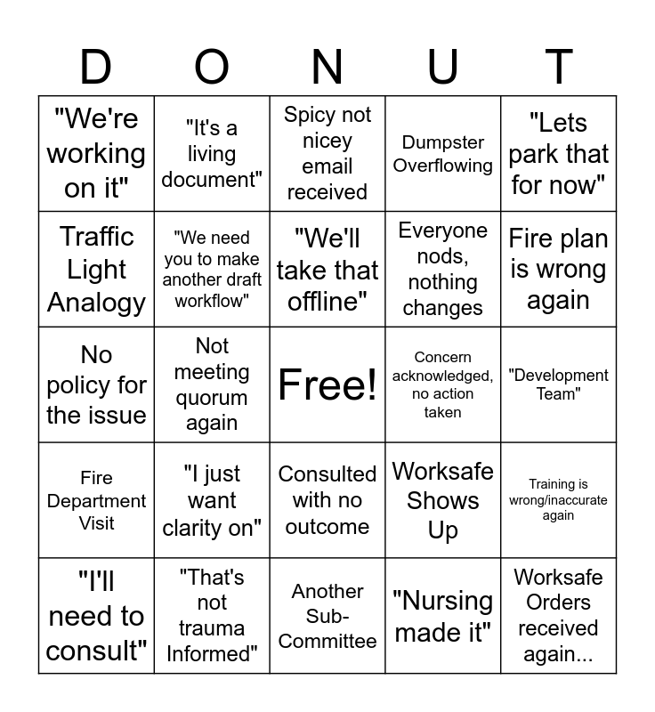 This bingo card has a free space and 24 words: "I just want clarity on", "That's not trauma Informed", "We'll take that offline", "I'll need to consult", "Lets park that for now", "We're working on it", Traffic Light Analogy, "It's a living document", Concern acknowledged, no action taken, Consulted with no outcome, Everyone nods, nothing changes, No policy for the issue, Worksafe Shows Up, Training is wrong/inaccurate again, "We need you to make another draft workflow", "Nursing made it", "Development Team", Spicy not nicey email received, Fire plan is wrong again, Not meeting quorum again, Worksafe Orders received again..., Fire Department Visit, Dumpster Overflowing and Another Sub-Committee.