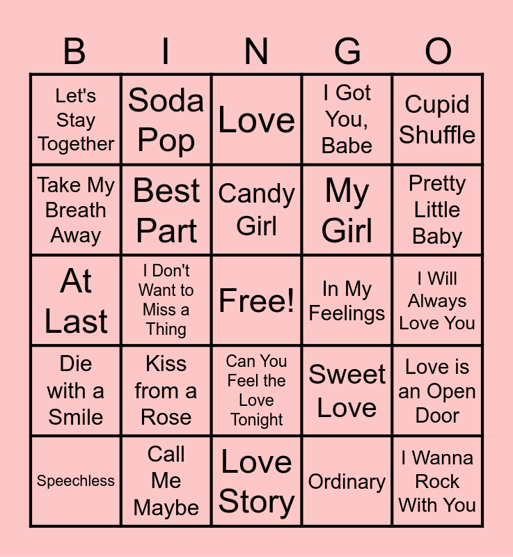 This bingo card has a free space and 41 words: All of Me, At Last, Baby, Best Part, Call Me Maybe, Can You Feel the Love Tonight, Candy Girl, Crazy in Love, Cupid Shuffle, Die with a Smile, I Don't Want to Miss a Thing, I Got You, Babe, I Wanna Rock With You, I Will Always Love You, In My Feelings, Kiss from a Rose, L-O-V-E, Let's Stay Together, Lose Control, Love, Love is an Open Door, Love on Top, Love Story, My Girl, My Heart Will Go On, No Tears Left to Cry, Ordinary, Perfect, Pretty Little Baby, PYT, Save Your Tears, Soda Pop, Speechless, Stay, Sweet Love, Take My Breath Away, Thank U, Next, Together Forever, Water Under the Bridge, What Makes You Beautiful and You’ll Be in My Heart.