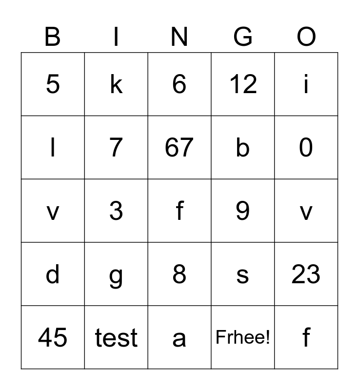 This bingo card has 30 words: test, 2, 3, 4, 5, 6, 7, 8, 9, a, v, f, Frhee!, f, 0, s, s, d, g, i, v, h, k, b, l, 12, 23, 45, 67 and 89.