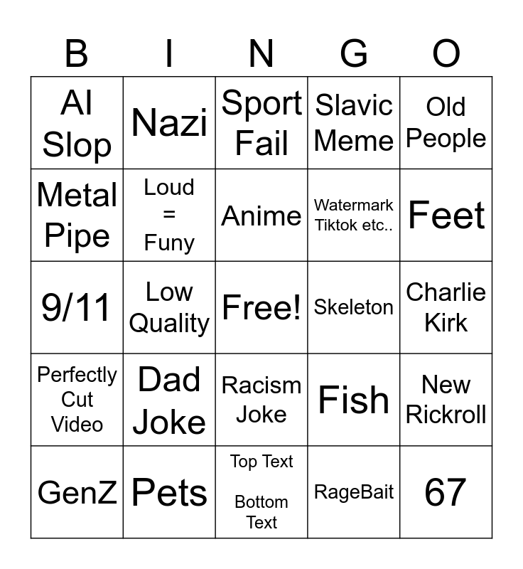 This bingo card has a free space and 24 words: Dad Joke, Pets, Anime, GenZ, Old People, AI Slop, Metal Pipe, Nazi, Skeleton, Racism Joke, Watermark Tiktok etc.., 9/11, Fish, New Rickroll, Loud = Funy, RageBait, Charlie Kirk, Sport Fail, Feet, Low Quality, 67, Perfectly Cut Video, Slavic Meme and Top Text Bottom Text.